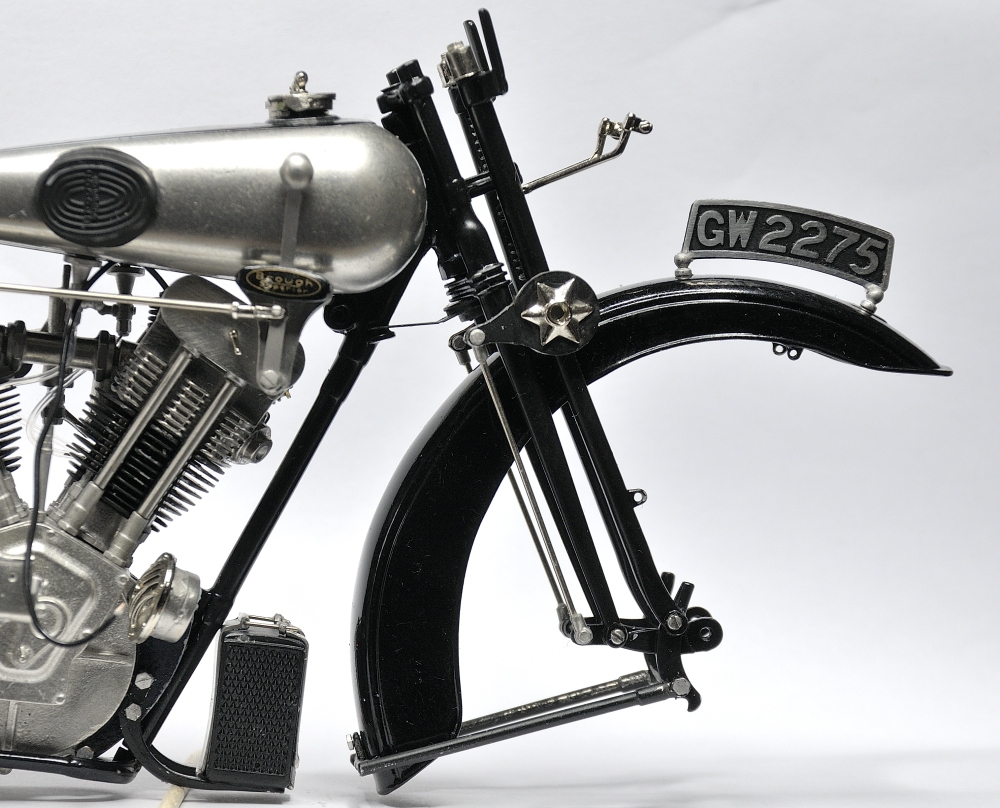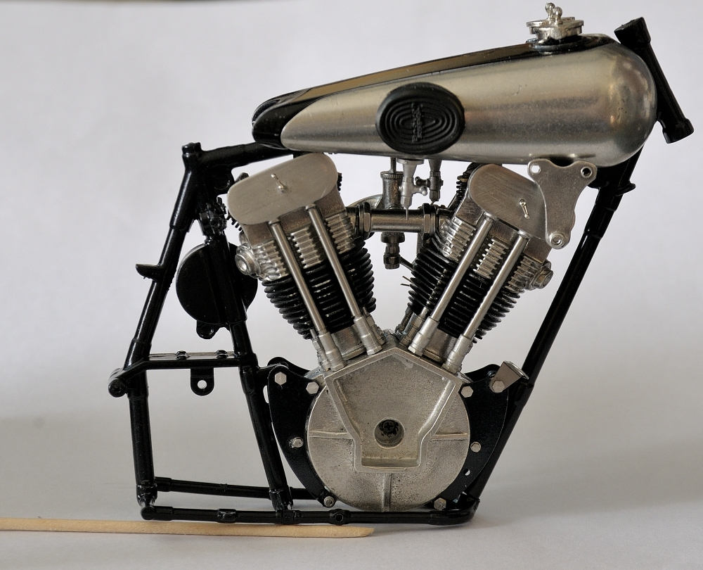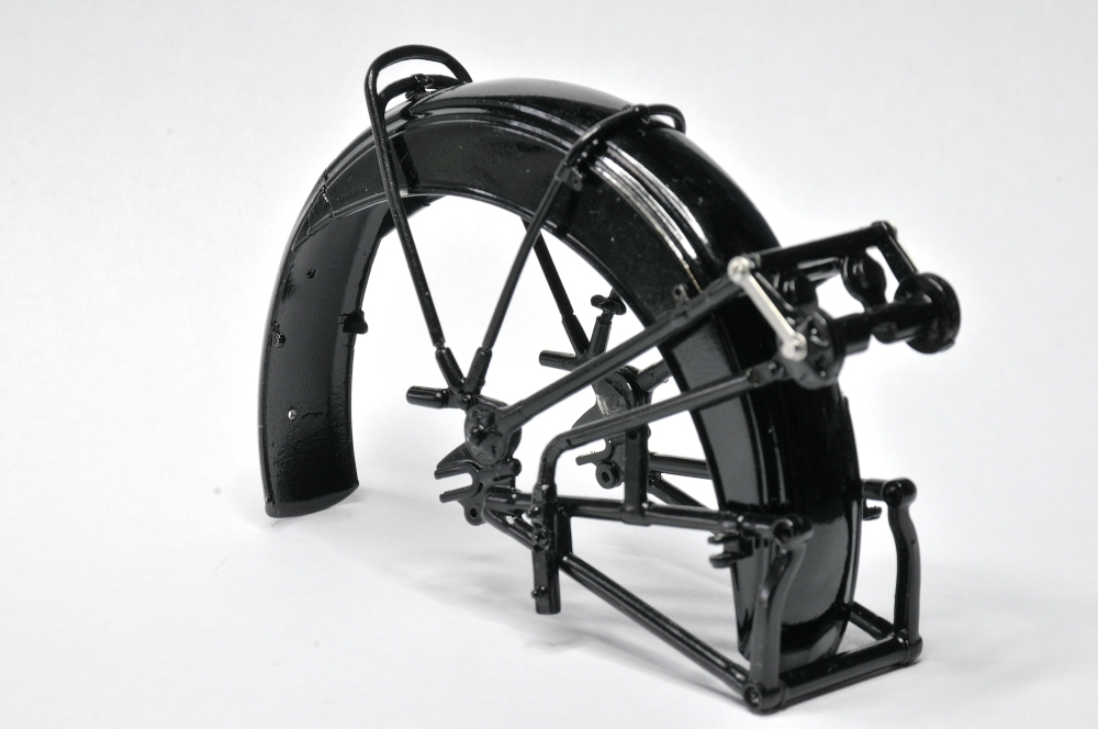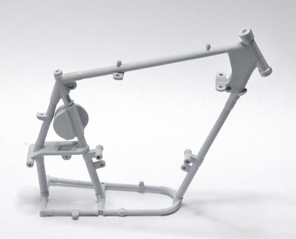 Frame striped back to bare metal then primed with an etch primer. With these models its not just a case of putting the parts together, all parts need to be cleaned up and smoothed, these are metal castings. Also the frame for example has over 20 holes drilled in it. You have to work out hole sizes which are important and drill these with referance to later steps in the instruction to tell you what goes where.
