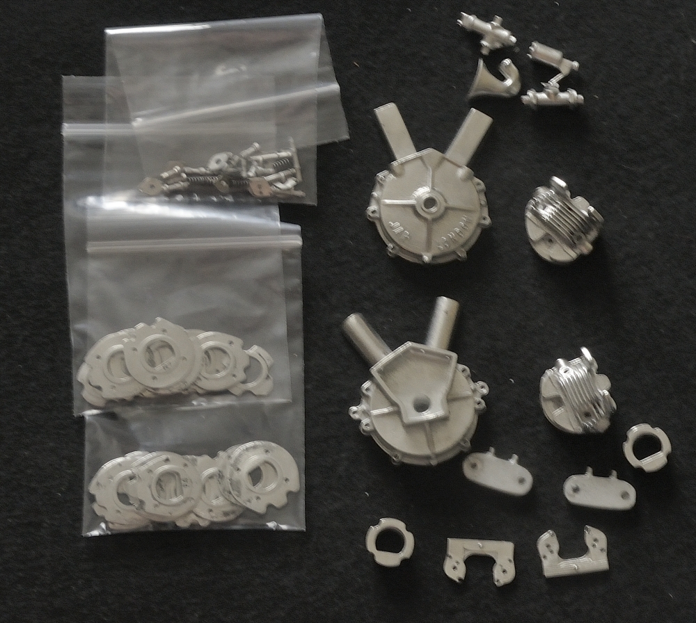 The engine disassembled and cleaned up. Metal parts are cleaned by placing in a jar with some acetone and then placed in the ultra sonic cleaner which strips paint and the super glue used to assemble the metal parts
