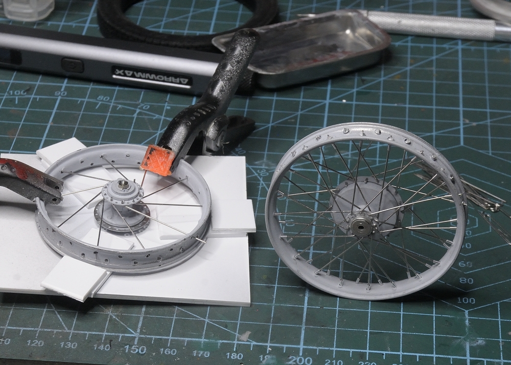 I had to make a jig out of plastic sheet to hold the hub central to the rim and clamp both parts to stop them turningv while i laced up the wheels, note i built both wheels at the same time.